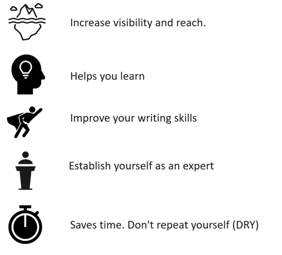 Don’t Repeat Yourself applies to explanations too. Instead of spending two hours giving someone an overview of a topic, I can point them to an article. I also refer back to my own posts as notes, which saves me time when I need to refresh my memory on something I worked on years ago.