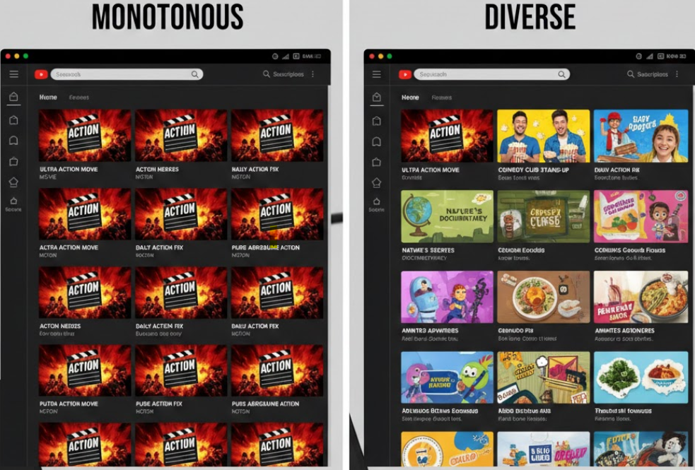 The top three slots go to nearly identical content. If the user wanted comedy, they have to scroll past three action videos. If they wanted a documentary, it’s buried at position 5.