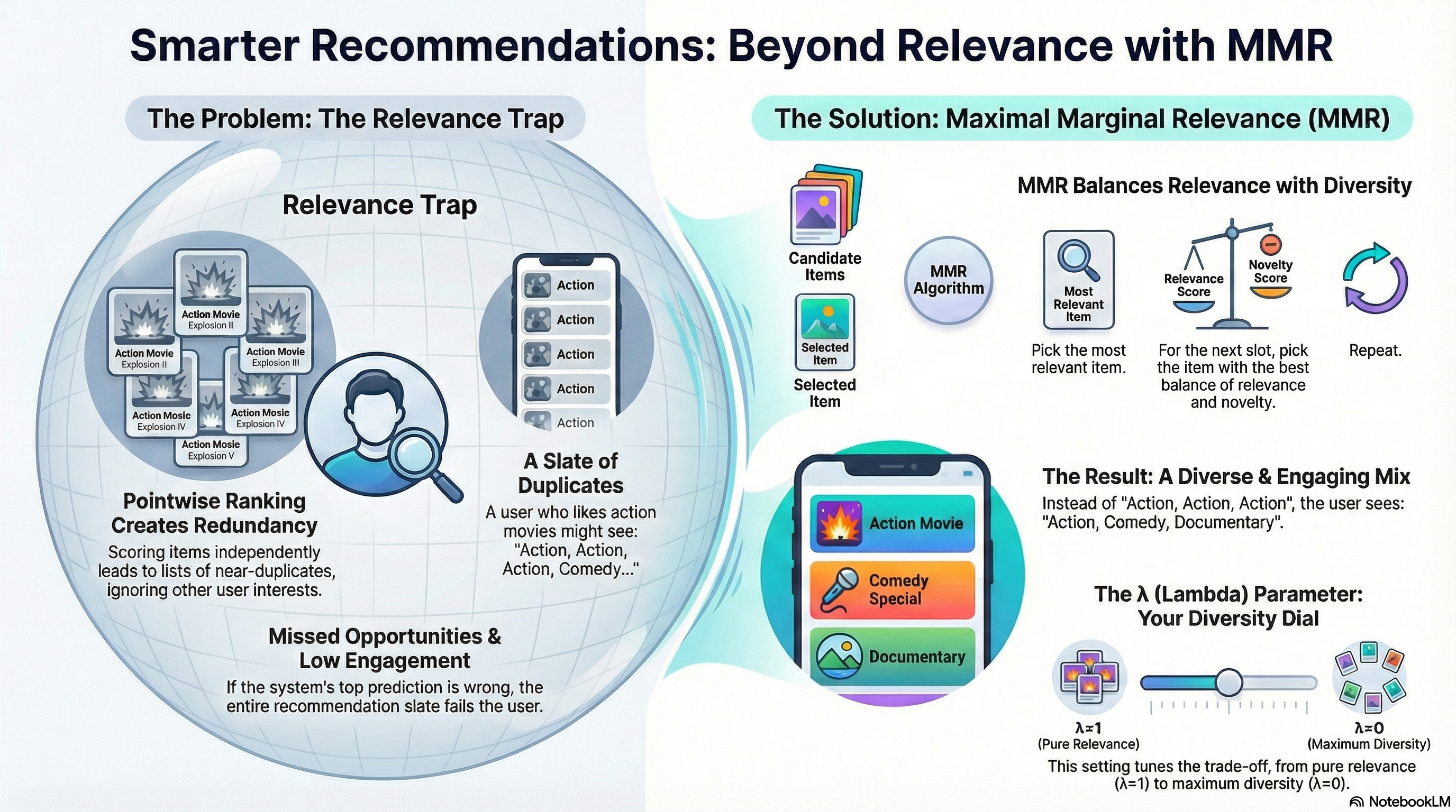 This is the core insight: marginal relevance matters more than absolute relevance. The 3rd action video isn’t 3x as valuable as the first. Each additional similar item has diminishing returns.