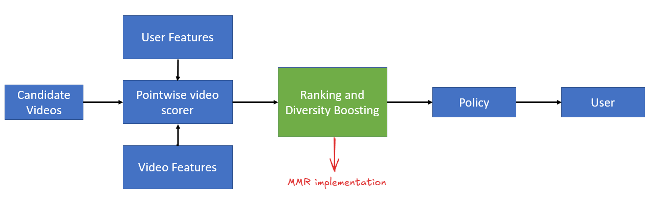 In terms of system design, diversity boosting can be added at various stages by using different techniques, but MMR falls into the class of re-rank algorithms which are typically applied after pointwise scoring.