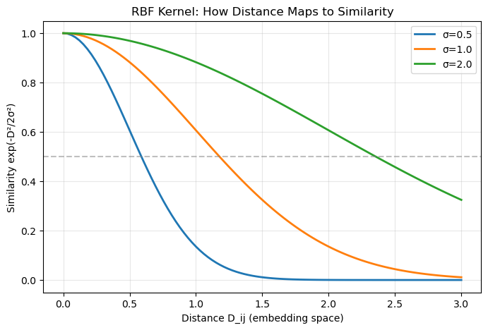 print(f"Similar set det(L): {np.linalg.det(L_similar):.3f}")Diverse set det(L): 1.000