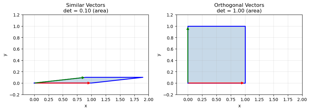 print(f"Orthogonal vectors determinant: {np.linalg.det(diverse_matrix):.3f}")Similar vectors determinant: 0.100