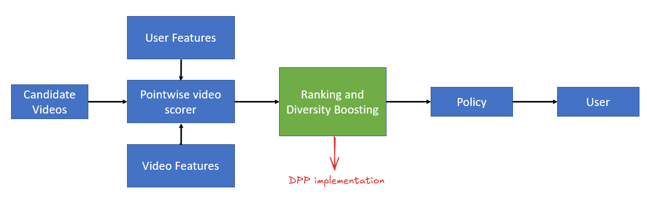 Now that we’ve covered DPP theory and implementation, let’s see how it fits into a production recommendation system. Recall from Part 1 the standard recommendation pipeline: