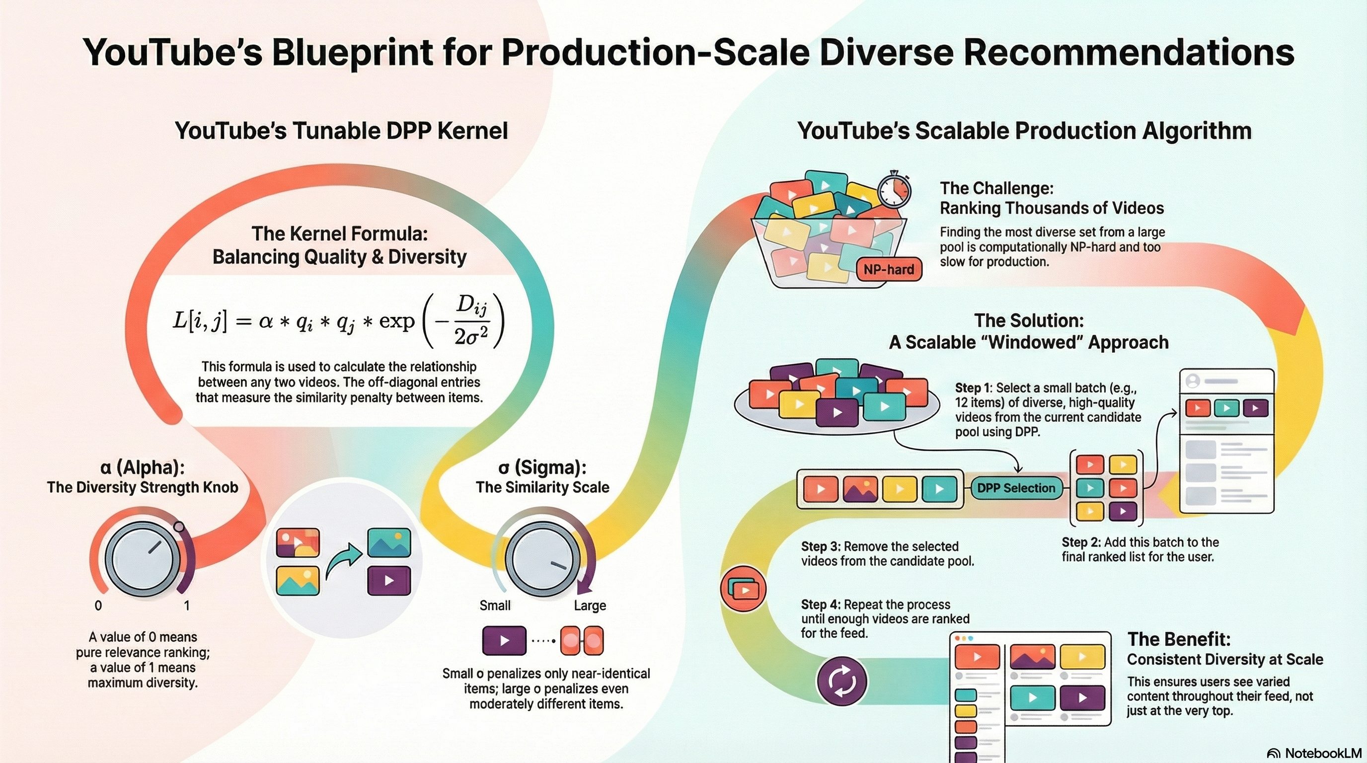 The windowed algorithm is YouTube’s production solution for bringing the mathematical elegance of DPPs to real-world scale. By processing items in batches, it maintains diversity guarantees while handling feeds with thousands of candidates in milliseconds.