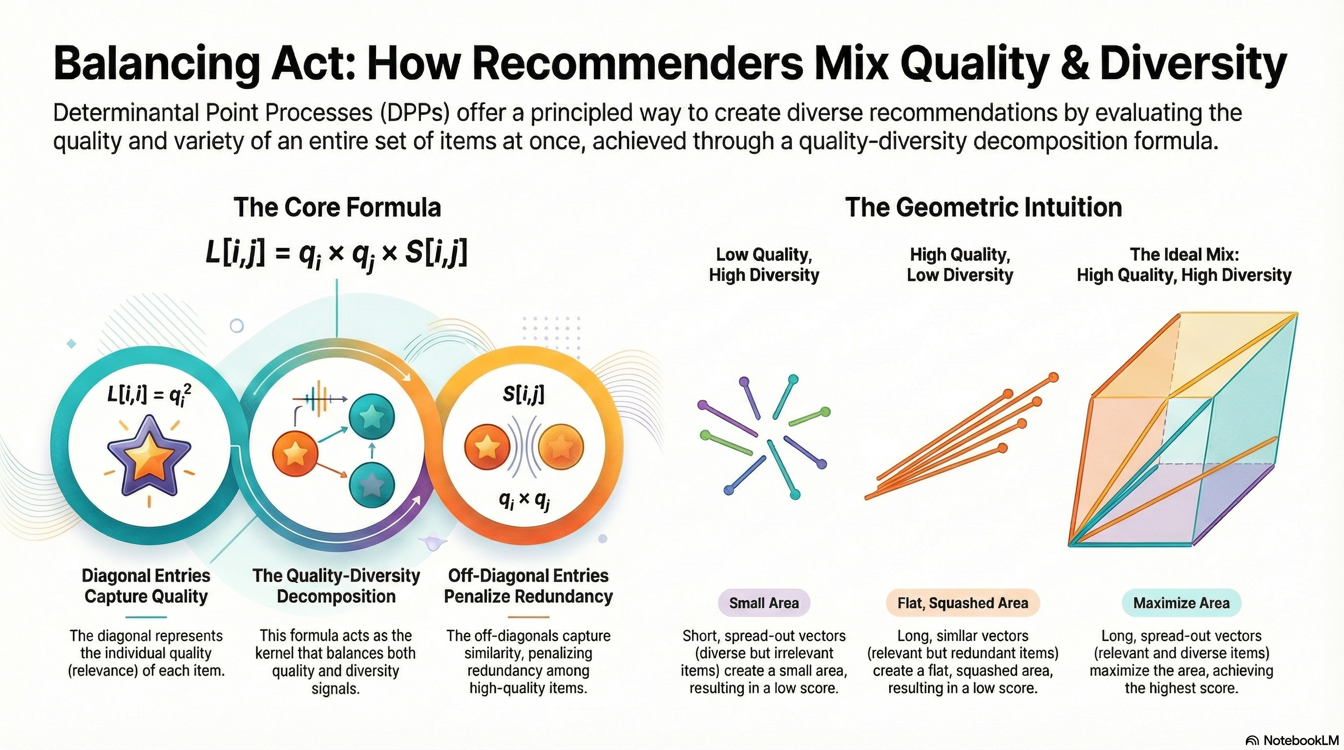 The key advantage of DPPs is that they give you a mathematically principled way to balance quality and diversity, backed by decades of research in probability theory. Once you understand the volume-based intuition, the system becomes just as interpretable as MMR but with stronger theoretical guarantees.
