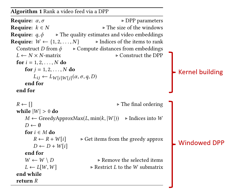 YouTube’s windowed approach scales to video feeds. By processing candidates in batches of k items (typically 6-12), the algorithm maintains diversity throughout long feeds, not just at the top. This makes DPPs practical for ranking hundreds or thousands of candidates in milliseconds.