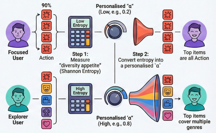 The idea comes from a Huawei research paper on personalized re-ranking, and the implementation is surprisingly simple: we measure how “diverse” each user’s past interactions have been using information theory (Shannon entropy), then use that to personalize α.