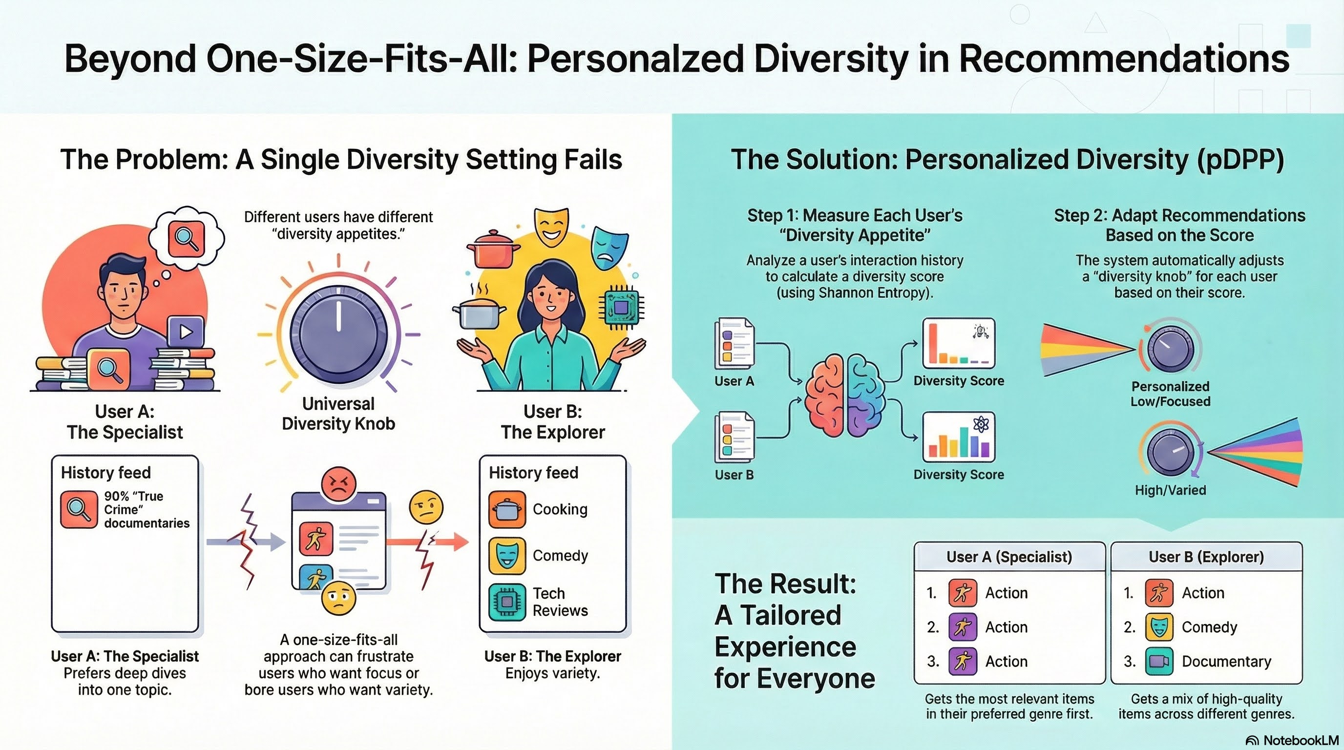 This is the core limitation of standard DPP: it treats diversity as a system-level knob, not a user-level preference. The solution? Personalized DPP (pDPP), which adapts the diversity-relevance tradeoff per user based on their historical behavior.