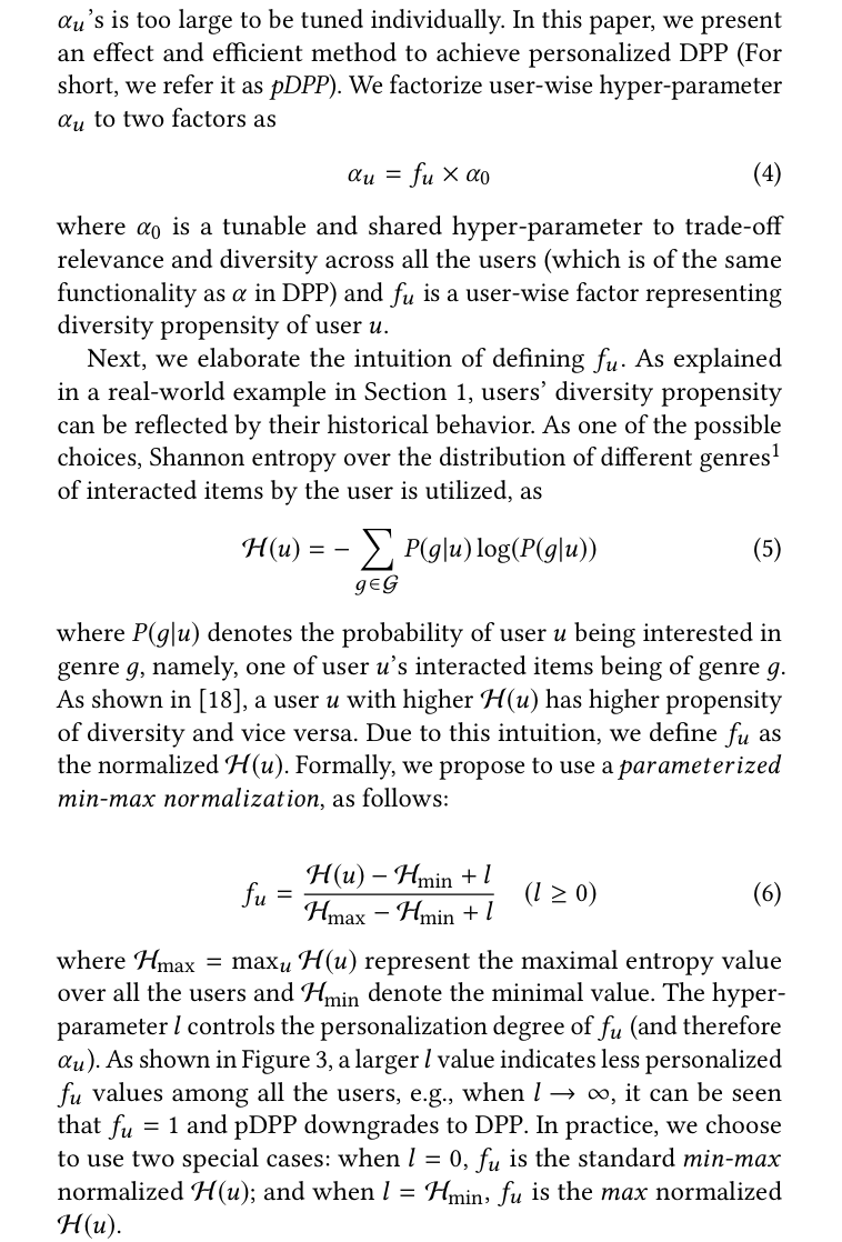 Standard DPP’s single α ignores that users have different diversity appetites. Shannon entropy over interaction history gives us a principled way to measure each user’s diversity propensity from their behavior.
