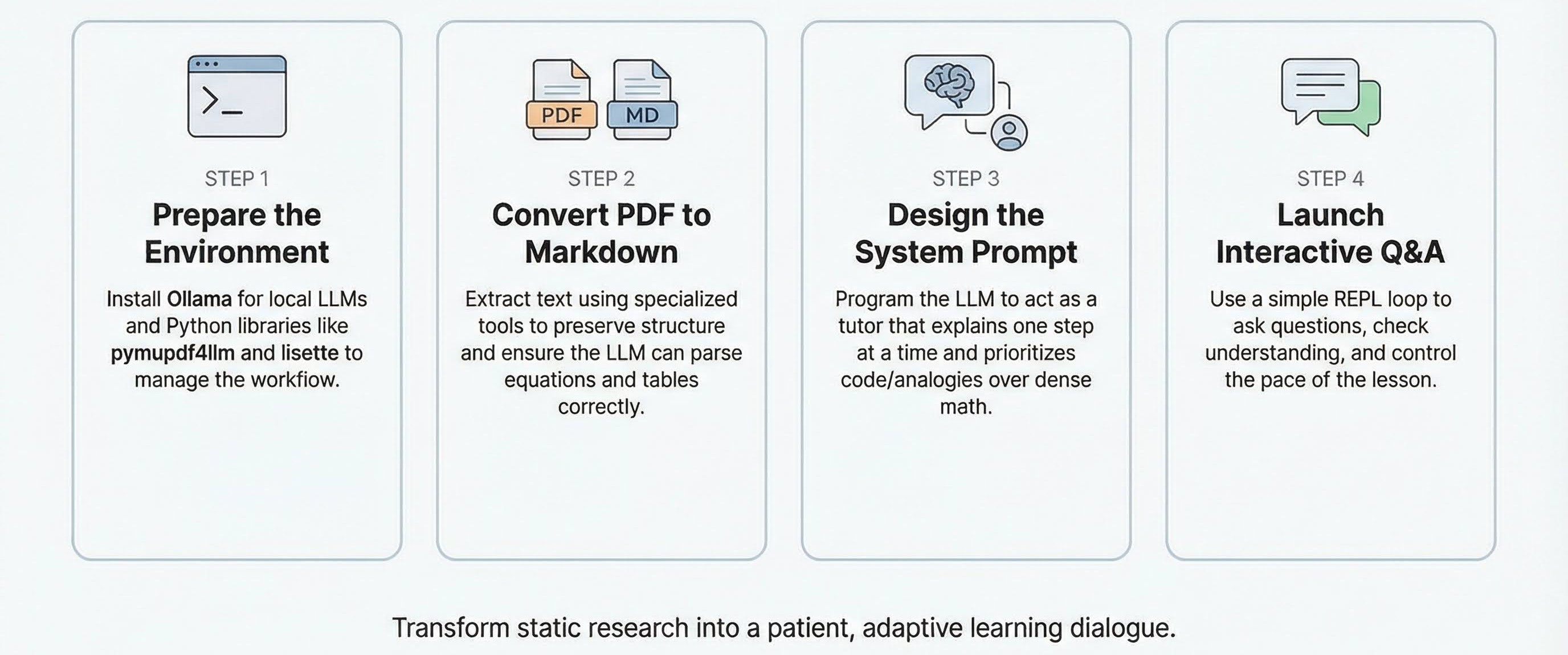 The workflow has two parts: getting the paper into a format LLMs can work with, then setting up the conversation so the AI becomes a useful tutor rather than a generic chatbot.